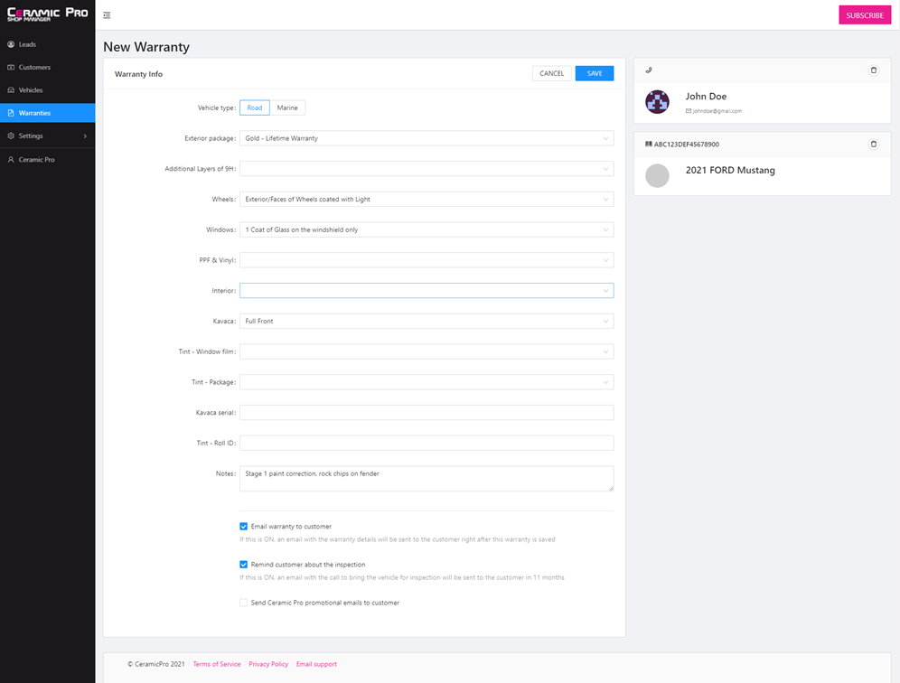 - Ceramic Pro sends out an inspection reminder email every 11 months if the "Remind customer about the inspection" checkbox is selected. This box is checked by default.