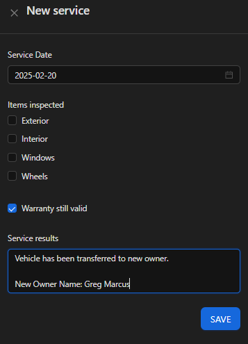 - In the 'Service results' you can write that the vehicle has been transferred to a new owner and give the new owner's name. Then click 'Save'