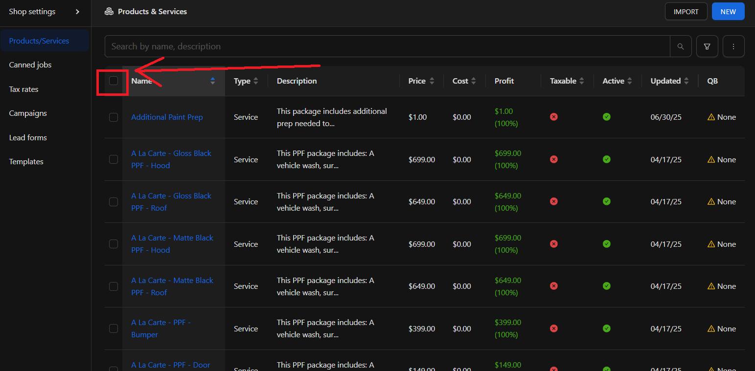 - Then once you are done, you'll need to connect each product and service to their respective product/service on Quickbooks. You can do this by going to the 'Products/Services' tab in Shop Manager. Then click the checkmark box next to the 'Name' column