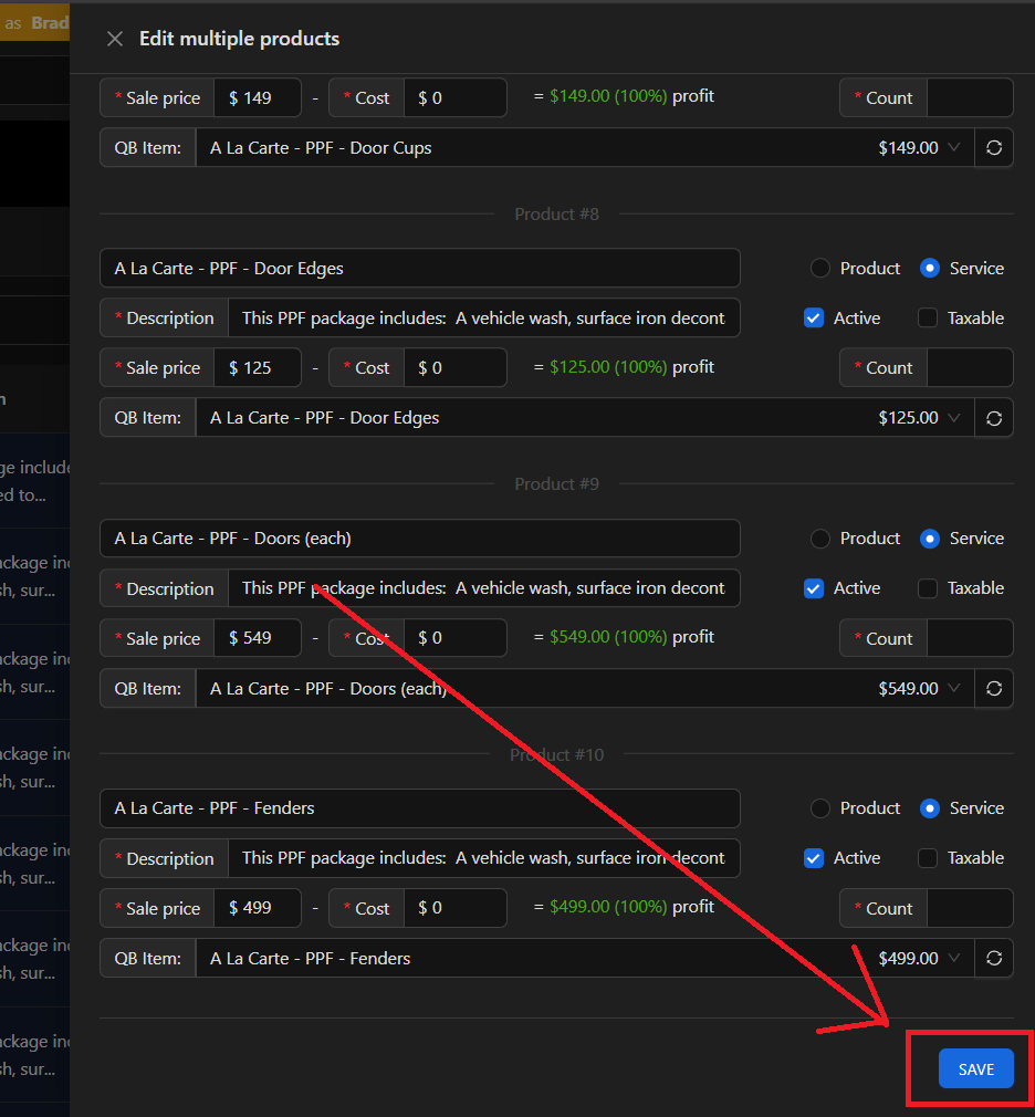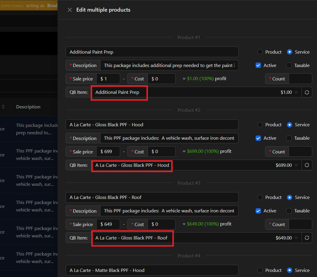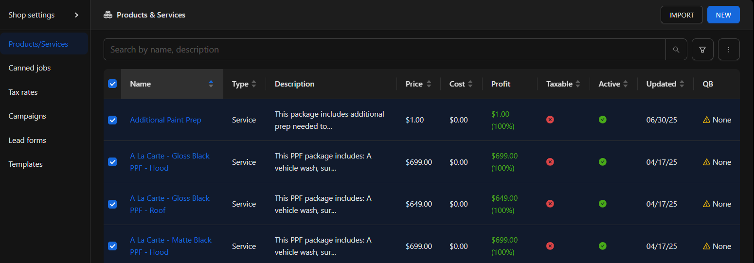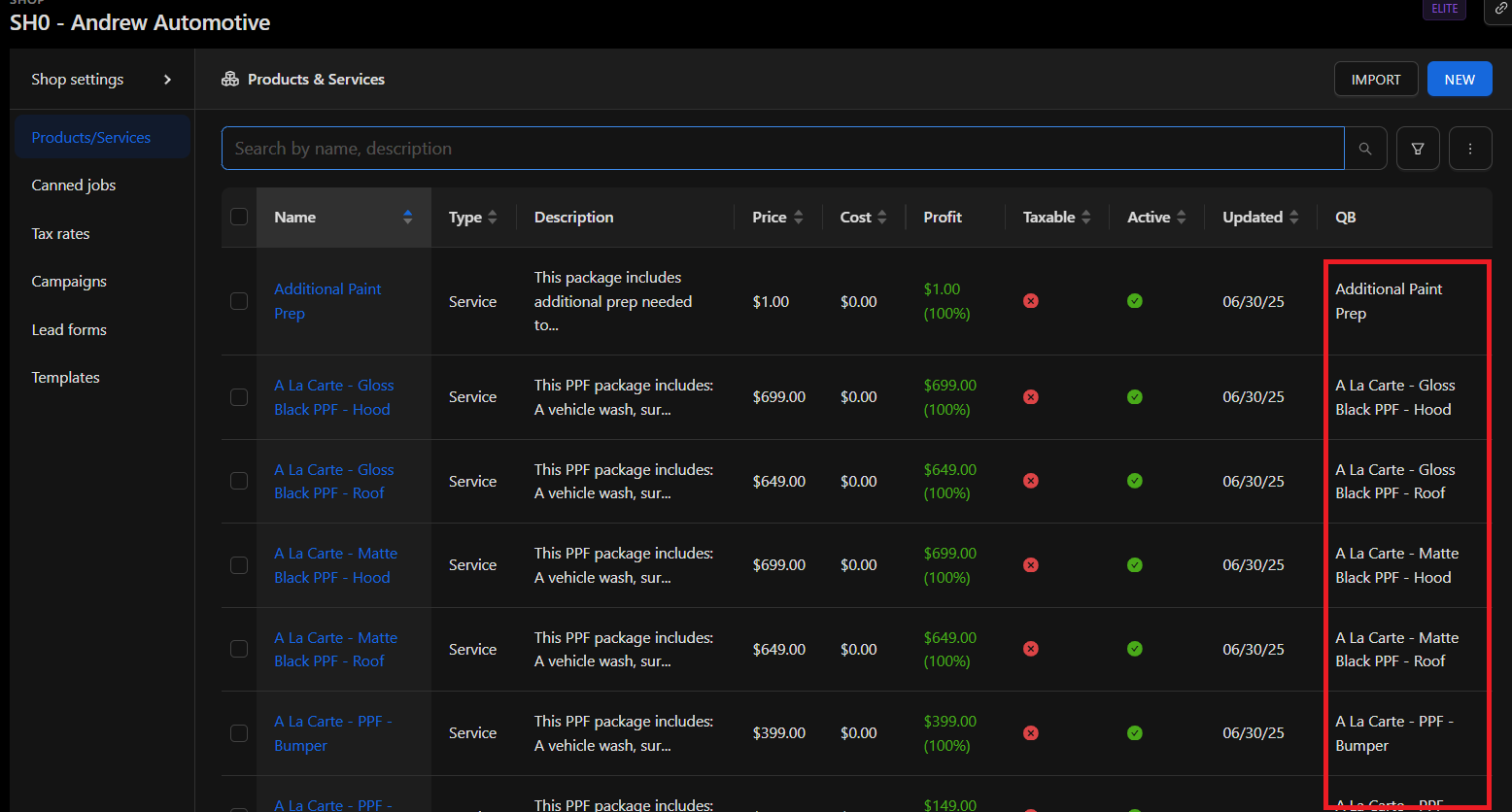 - Now the 'QB' column will show the name of the product/service in Quickbooks that is connected. That means that service is fully connected to Quickbooks. So when the services is used in a work order, it will sync to Quickbooks when the work order is moved to the 'Completed' stage.