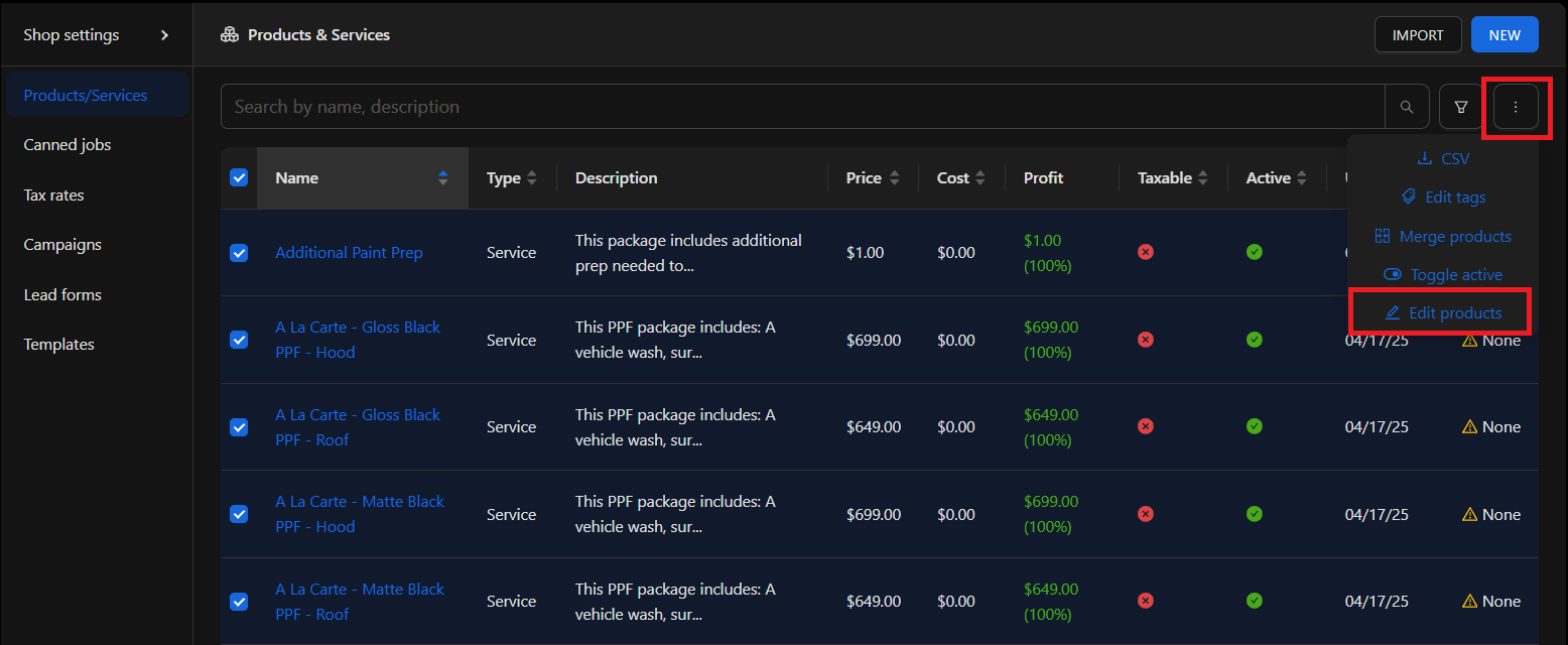 - Next you can click the three dotted button on the top right, then click 'Edit products'