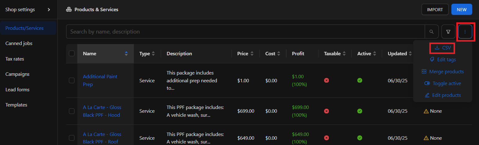 - Now you'll need to make sure you have the same products/services in Shop Manager and in your Quickbooks. If you would like to transfer your products/services from Shop Manager to Quickbooks, you can download the CSV by going to the 'Product/Services' tab, then clicking on the three-dotted button on the top right, then click 'CSV'