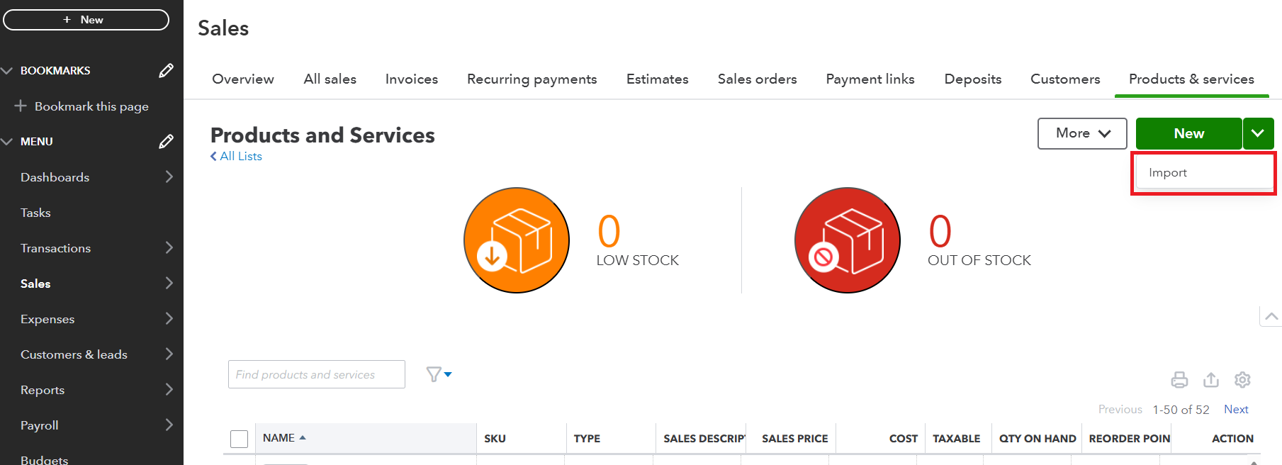 - Then go to your Quickbooks. Go to 'Sales' on the left hand side, then 'Products & services'. Then click the downward arrow on the top right, then click 'Import'. It may also say 'Batch Import' which is fine.