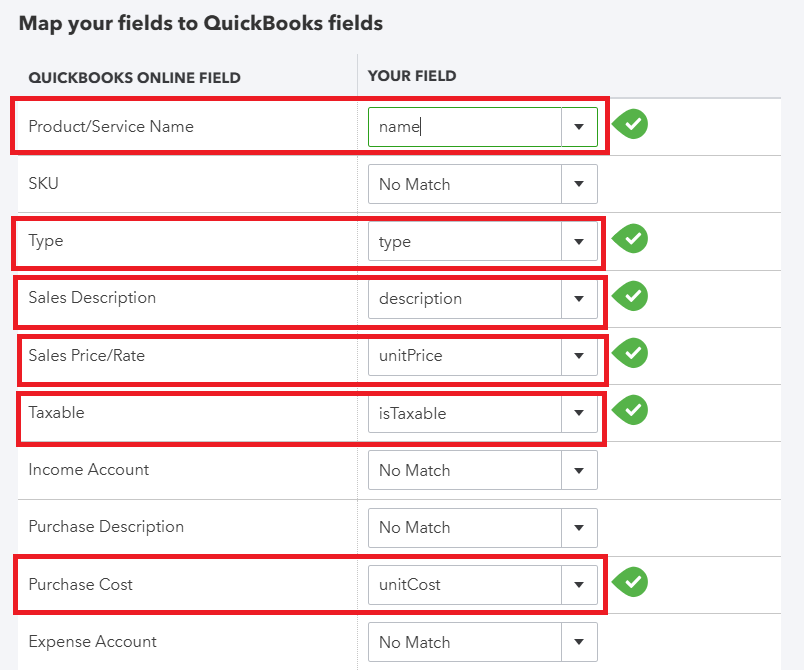 - When you map the columns, make sure you have it as below. Then you can continue to import the products/services into Quickbooks.