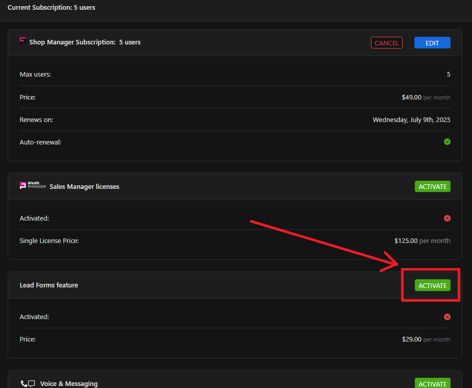 - To enable the Lead Forms Feature, go to your Shop Manager account, then go to Settings > Subscription > then click 'Activate' on the 'Lead Forms Feature'