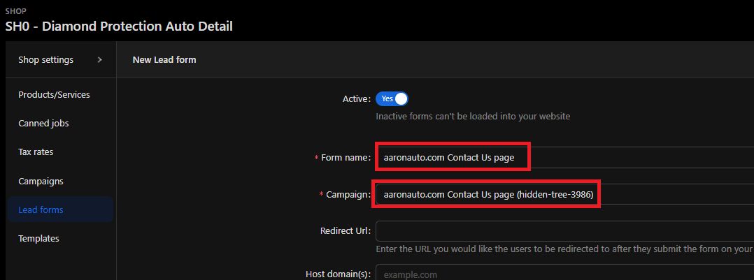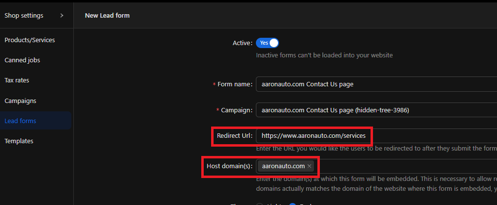 - For the 'Redirect URL', you can enter the page you want to send the lead to after they fill out the form. Redirecting them to your Services or About Us page is a great way to get them to learn more about your shop.